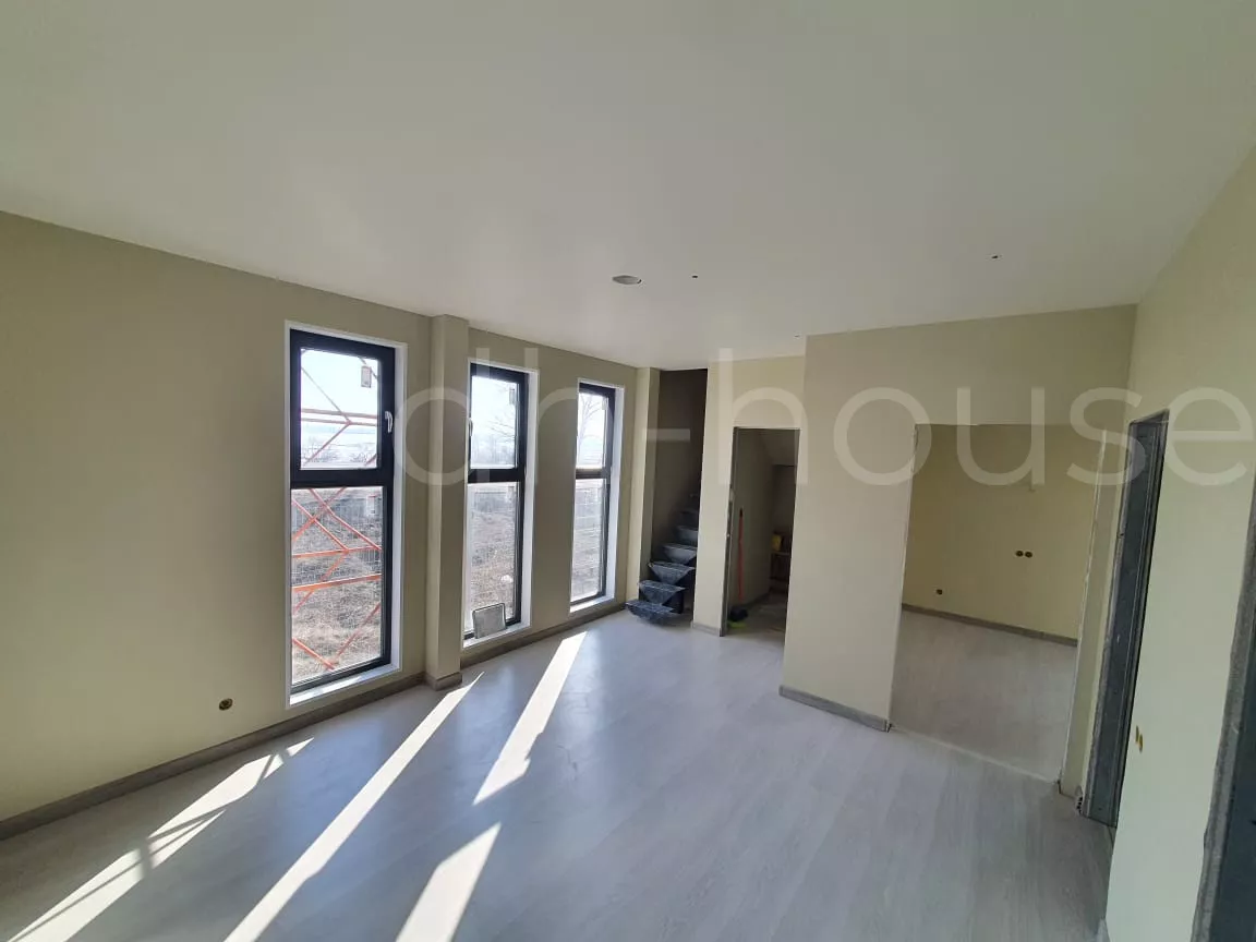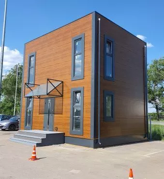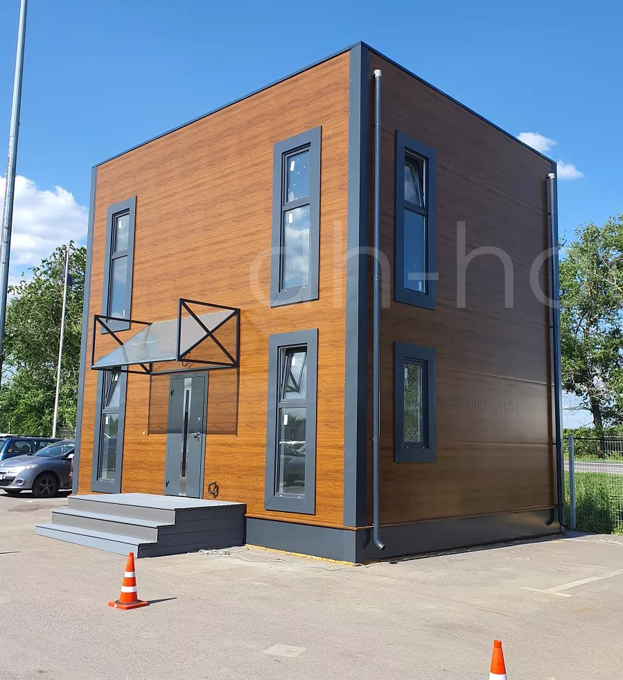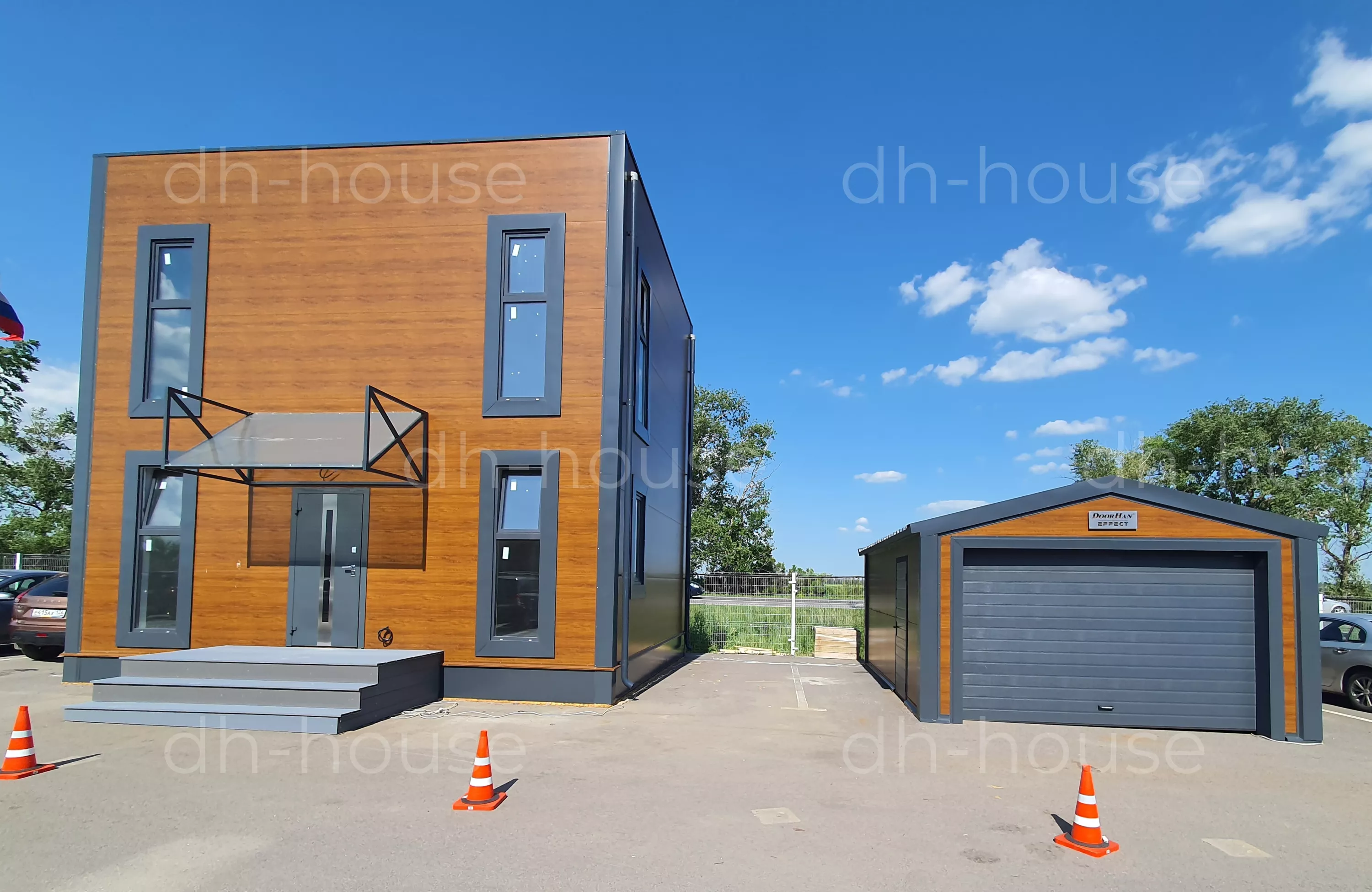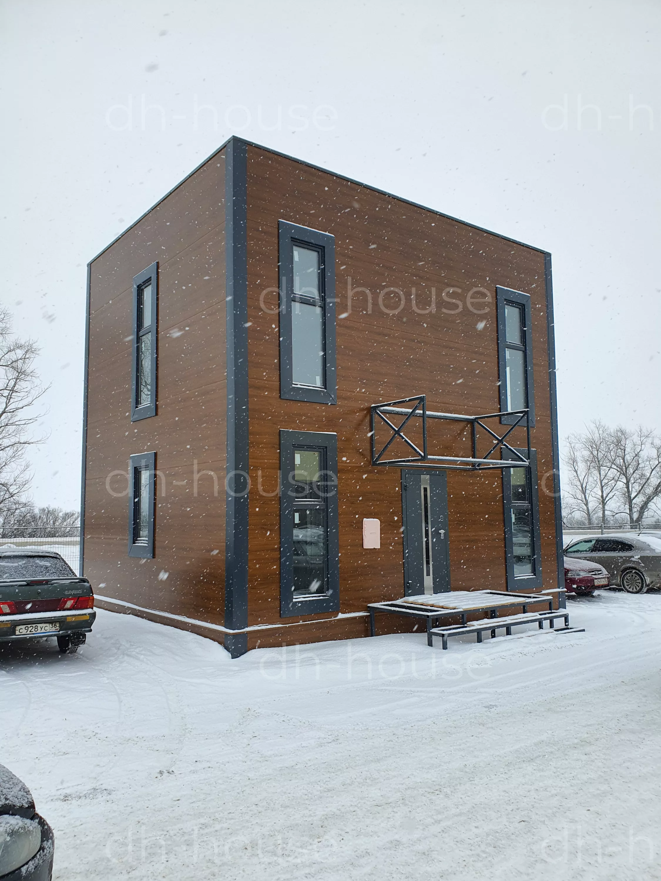 Быстровозводимый модульный дом EFFECT LIGHT 89 — современный проект, построенный из металлоконструкций и качественных материалов. Это обеспечивает высокую пожаробезопасность строения, комфортное пребывания внутри помещений в любое время года. Стильный экстерьер готового модульного дома выразительно подчеркивают высокие окна в пол. Они обеспечивают панорамный обзор и достаточное количество света, поступающего в помещение. Каркасный дом не требует дополнительной внешней или внутренней отделки. Над крыльцом размещен большой навес, защищающий ступени от снега и дождя.